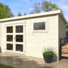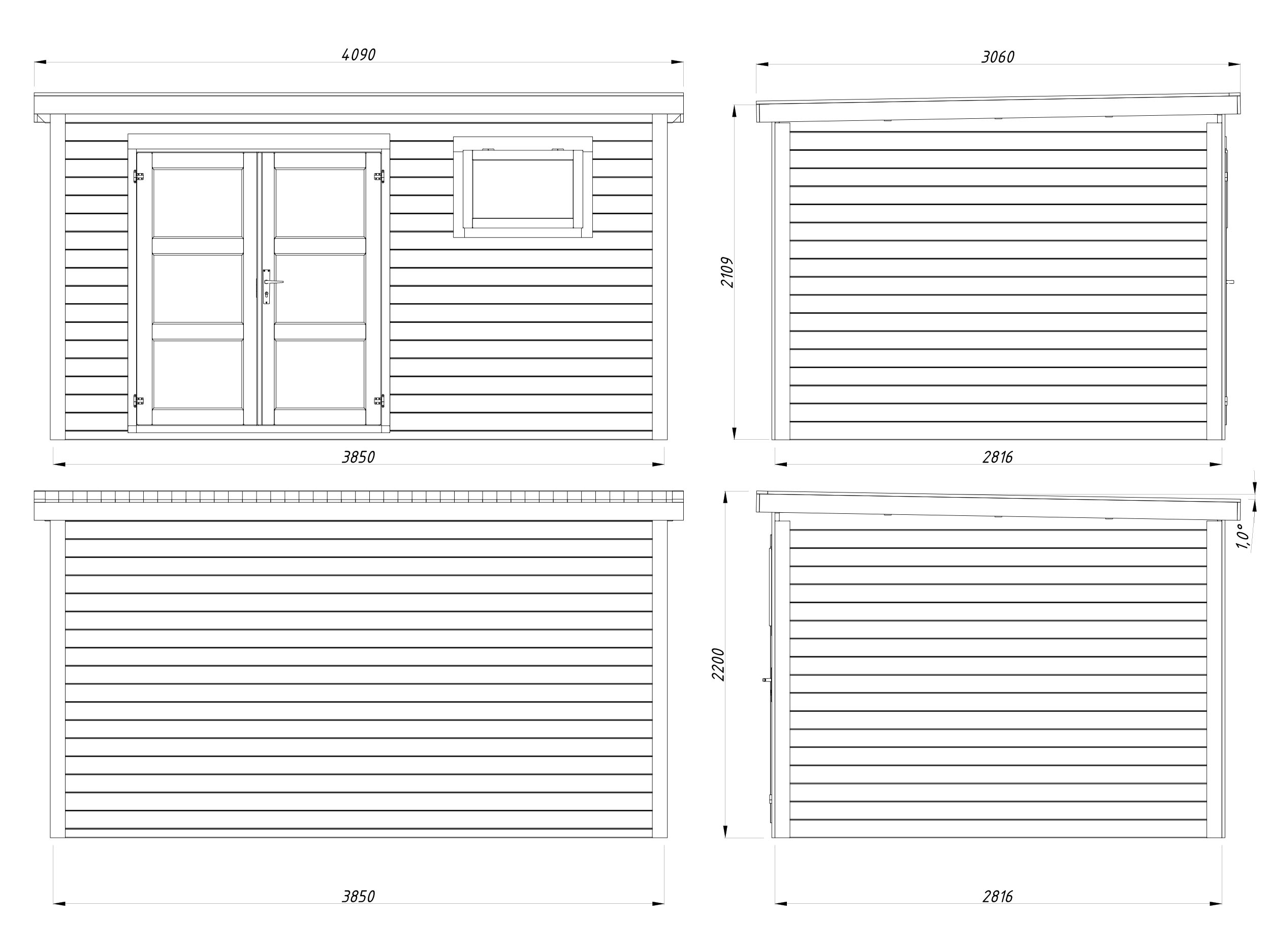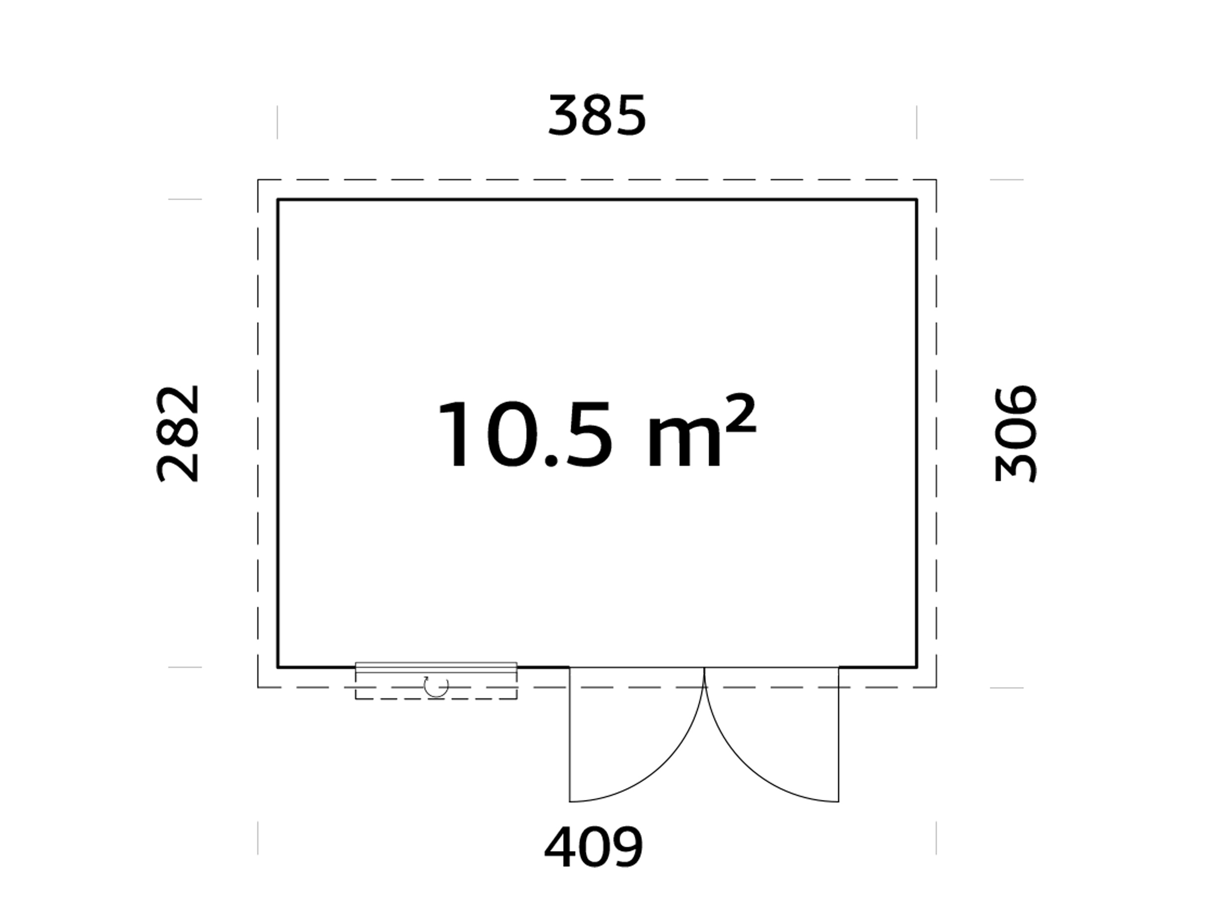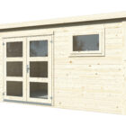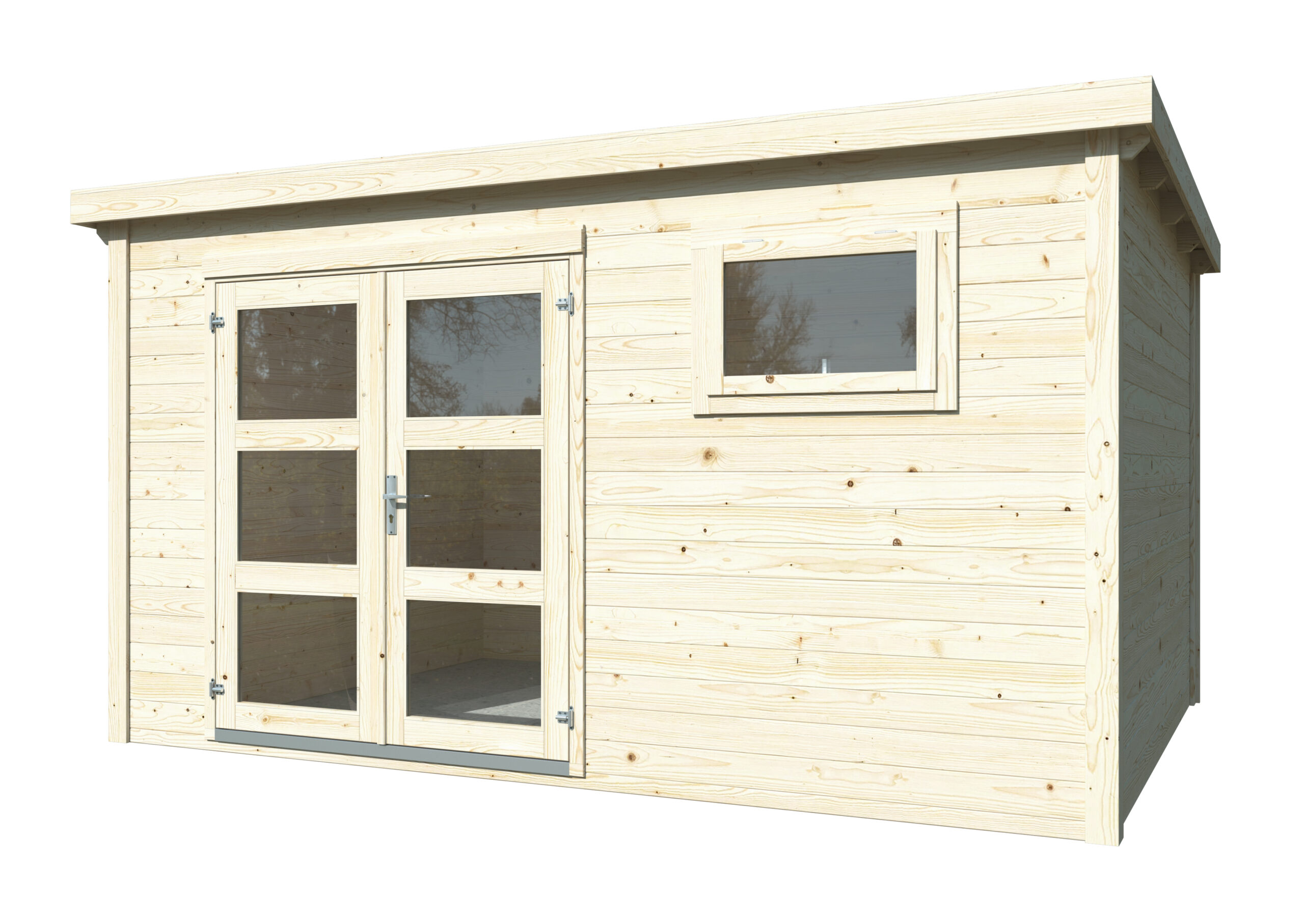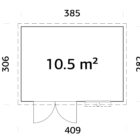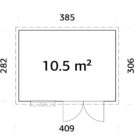 CASETTA LYA B 385X282. Abete non trattato. Dimensioni a terra: 385 x 282 cm.