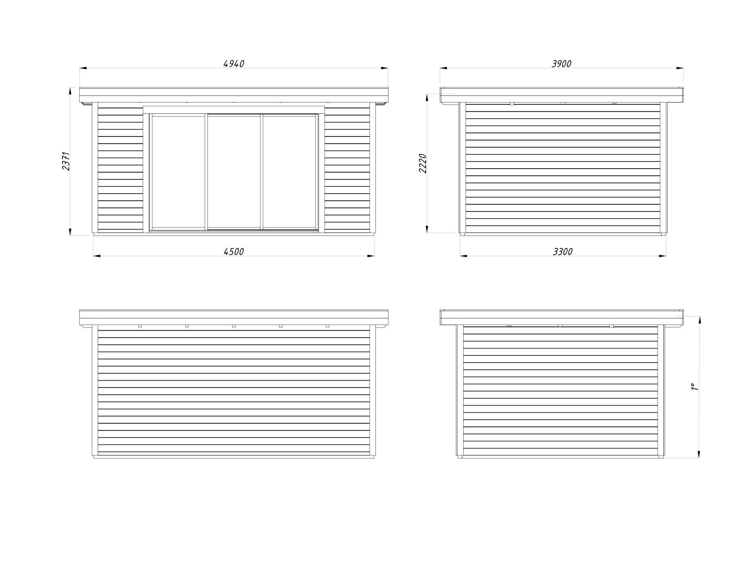 CASETTA LYDIA C 450X330. Abete non trattato. Dimensioni a terra: 450 x 330 cm.