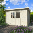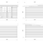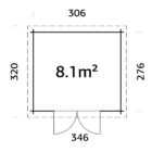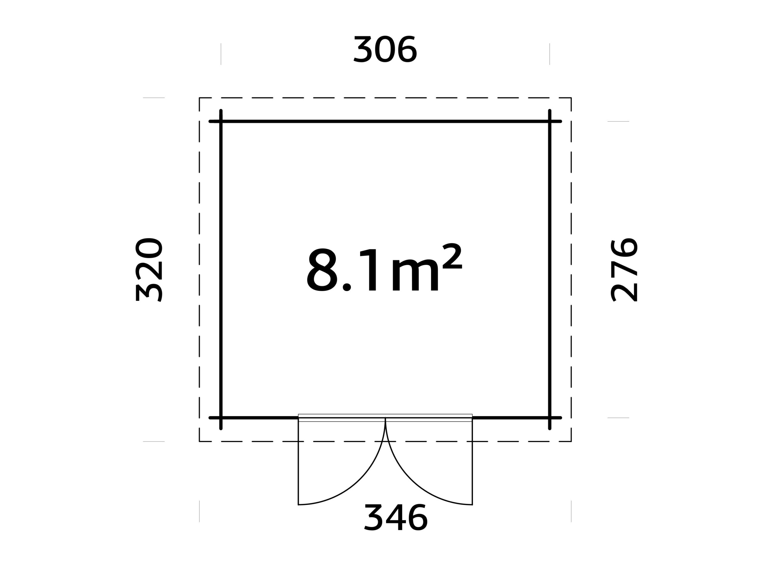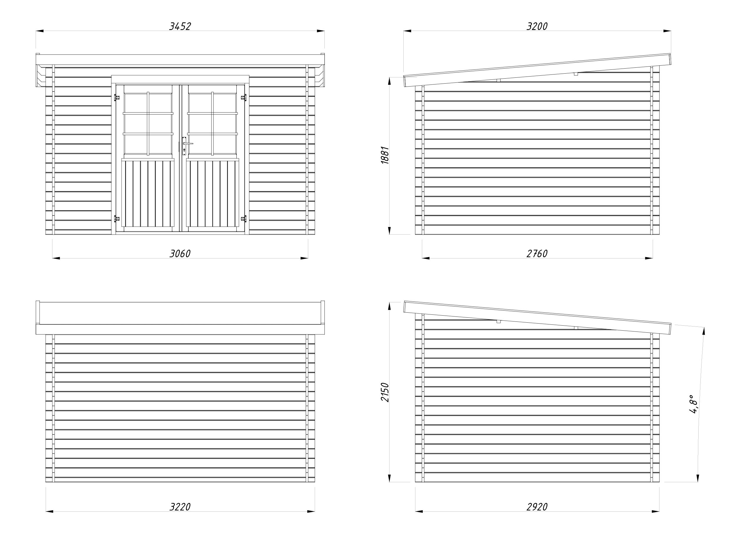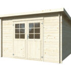 CASETTA NORA A 322X292. Abete non trattato. Dimensioni a terra: 322 x 292 cm.